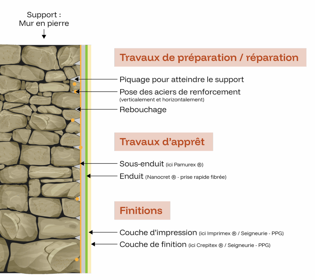 Coupe du système de peinture dans le cadre de la reprise du mur de la maison de M. Kermagoret (Note : L’application du RSE ou RPE nécessite de se trouve au droit de la zone d’application donc un échafaudage pour les applications au-dessus de 200 cm.­